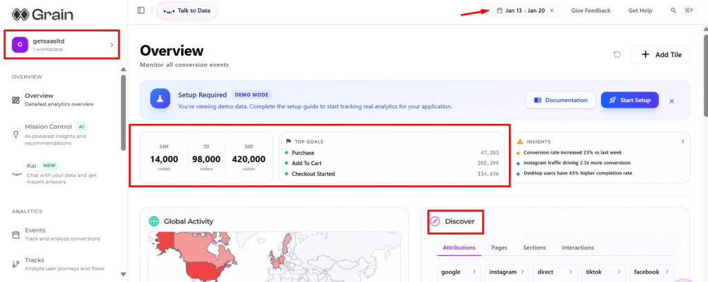 Grain’s dashboard is refreshingly simple. The main screen shows your key metrics without overwhelming you. You see visitor count, conversions, and top pages at a glance.
