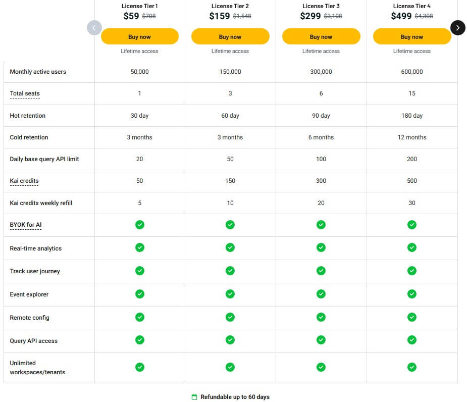 Tier 1 ($59) is perfect for small websites and startups. You get 50,000 monthly visitors tracked, which covers most small businesses. Data stays “hot” (quickly accessible) for 30 days.